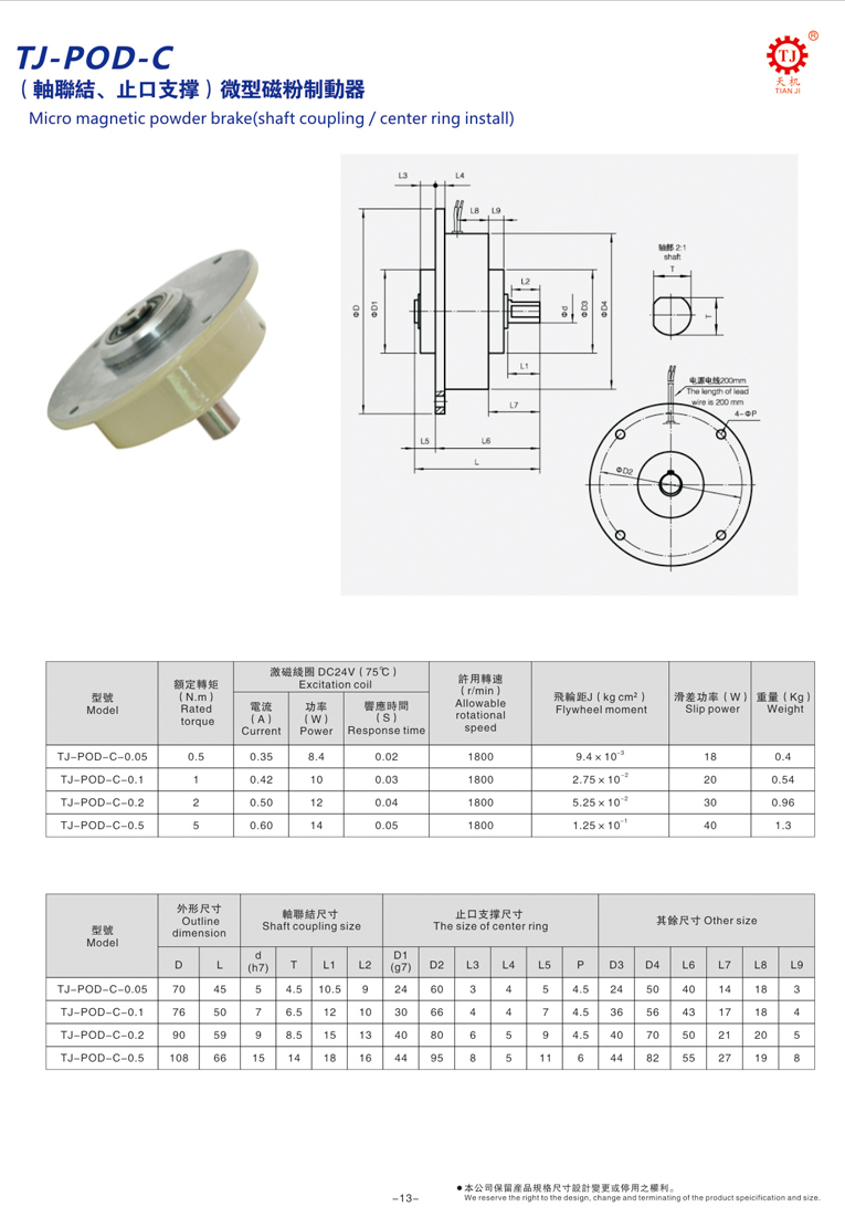 概述POD-C微型軸式磁粉制動器的選型一般以所需傳達最大轉矩為依據來選定,并同時注意保證實際滑差功率小于磁粉離合器、制動器的允許滑差功率。