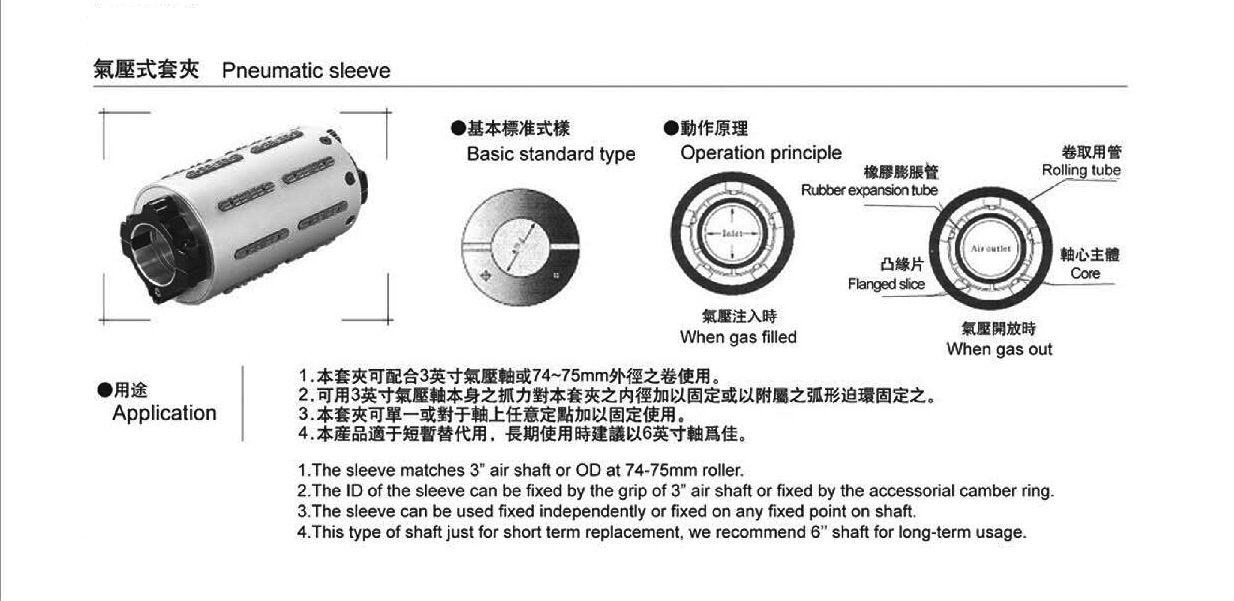 鍵式氣脹軸套夾廣泛應用于:分條機、模切機、復卷機、紙筒機、制袋機、貼合機、覆膜機、吹膜機、發(fā)泡機、淋膜機、壓紋機、造紙機、無紡布機、驗布機、燙金機等收卷放卷機械中。