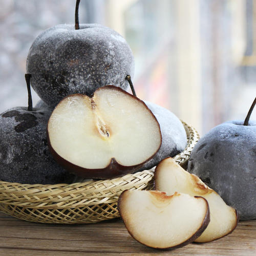 北方凍梨是寒冬贈與的甜品。把新鮮的梨子隨手放在氣溫最低能達到零下三四十度的室外凍上一夜,經過一夜的“雪打風吹”裹著一層霜雪的凍梨就做好了。想吃凍梨的時候,把凍的像石頭一樣的梨子在室溫下用涼開水浸泡解凍半小時,這時梨子的表面就會結出一層薄冰,掰開冰膜,一口咬下,整個口腔瞬間“透心涼,心飛揚”,而這凍梨也是暖氣房里“潤燥”的佳品。